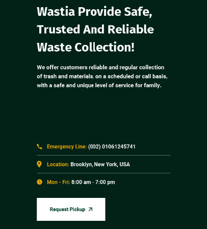 Wastia Provide Safe, Trusted And Reliable Waste Collection! We offer customers reliable and regular collection of trash and materials, on a scheduled or call basis, with a safe and unique level of service for family. Customer Service: (002) 01061245741 Location: Brooklyn, New York, USA Mon – Fri: 8:00 am – 7:00 pm Request Pickup